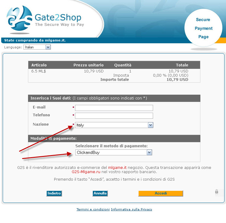 1. Scegliamo il modo di pagamento "ClickAndBuy".